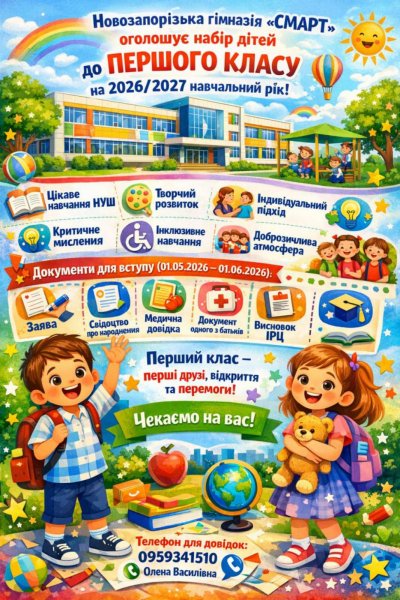 Новозапорізької гімназії «СМАРТ» оголошує набір дітей до першого класу на 2026/2027 навчальний рік! У нашій гімназії дитина навчається із задоволенням, розкриває свої таланти та впевнено крокує до мрії. Гімназія «СМАРТ» це : - цікаве та ефективне навчання за програмою НУШ - розвиток творчих здібностей - забезпечення індивідуального підходу до кожної дитини - розвиток критичного мислення - інклюзивне навчання - комфортна та доброзичлива атмосфера.
