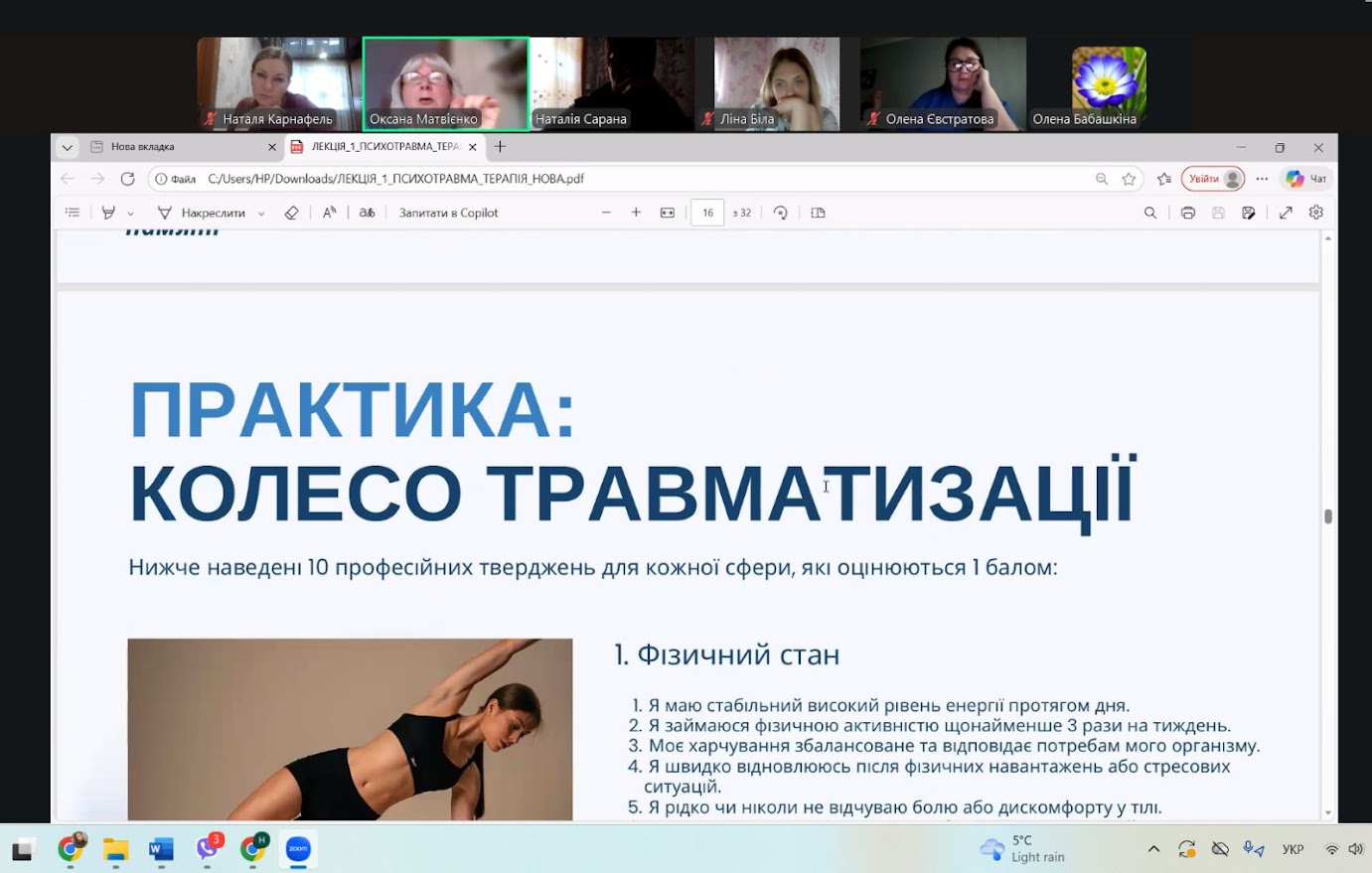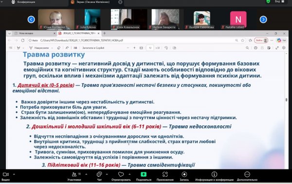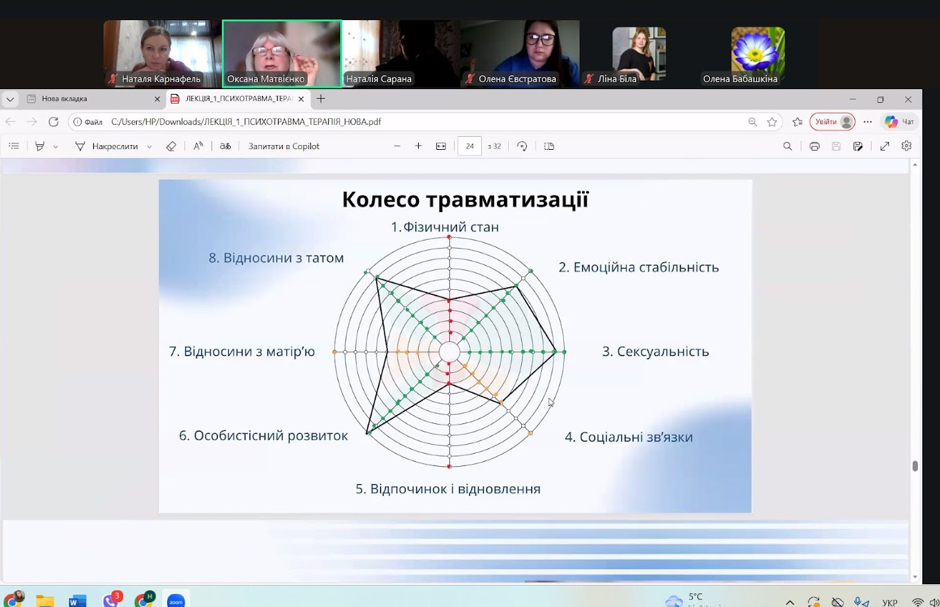 Практичний психолог Новозапорізької гімназії «СМАРТ» Матвієнко О. Д. провела для педагогічних працівників семінар-інтенсив «Розуміння травми і мій поточний стан». Мета заходу - сформувати цілісну картину психотравми і зрозуміти, як вона впливає на стан "тут і зараз". Крім теоретичної частини, були проведені діагностика стану "Колесо травматизації" і рефлексивна практика "Судина емоцій"