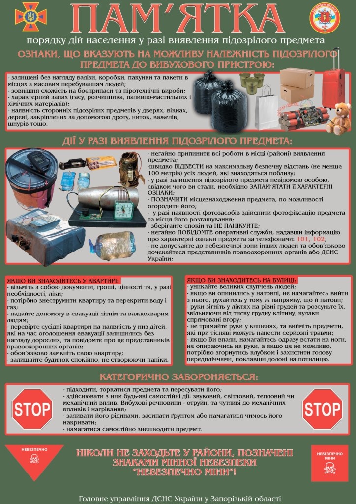 - не допускайте сторонніх осіб до небезпечного предмета доки не прибули фахівці;