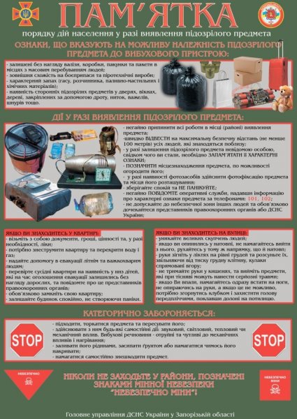 - якщо ви виявили вибухонебезпечний чи просто підозрілий предмет – негайно повідомте місцеві органи влади та за телефонами 101 та 102. Навіть якщо ви не впевнені, що цей предмет небезпечний – краще перестрахуватися. Адже запобігти краще, ніж ліквідовувати наслідки. Окрім того, треба дочекатися приїзду спеціальних служб, щоб точно вказати місце та обставини виявлення.